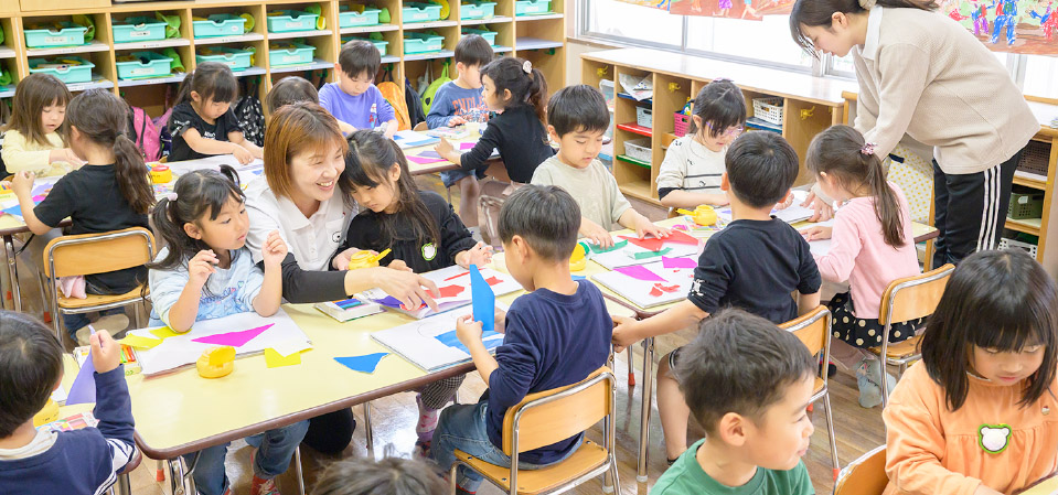 そのために当園では、健康・表現・環境・言葉・人間関係の五領域を通したバランスのよい養護的・教育的援助を行っています。